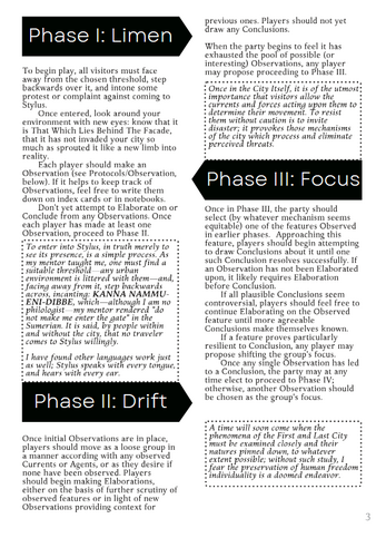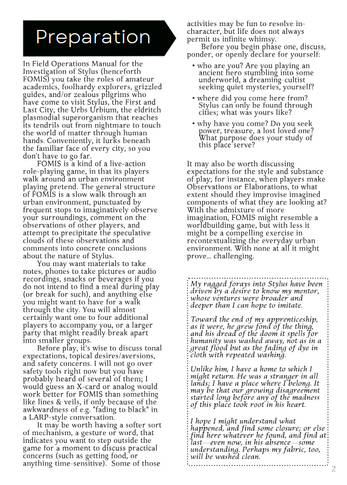 In Field Operations Manual for the Investigation of Stylus, henceforth FOMIS, you take the role of amateur academics, foolhardy explorers, grizzled guides, and/or zealous pilgrims who have come to visit Stylus, the First and Last City, the Urbs Urbium, the eldritch plasmodial superorganism that reaches its tendrils out from dreaming to touch the world of matter through human hands. Conveniently, it lurks beneath the familiar face of every city, so you don't have to go far. Whether Stylus is harmful or ultimately beneficial to humanity, mindlessly digesting the world or regarding humanity with a vast and alien intelligence—all this is yours to discover.